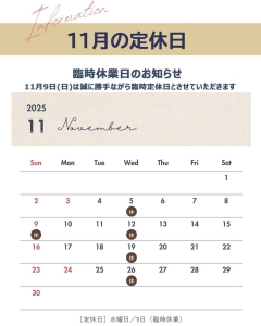 誠に勝手ながら11月9日(日曜日)は臨時休業とさせていただきます。