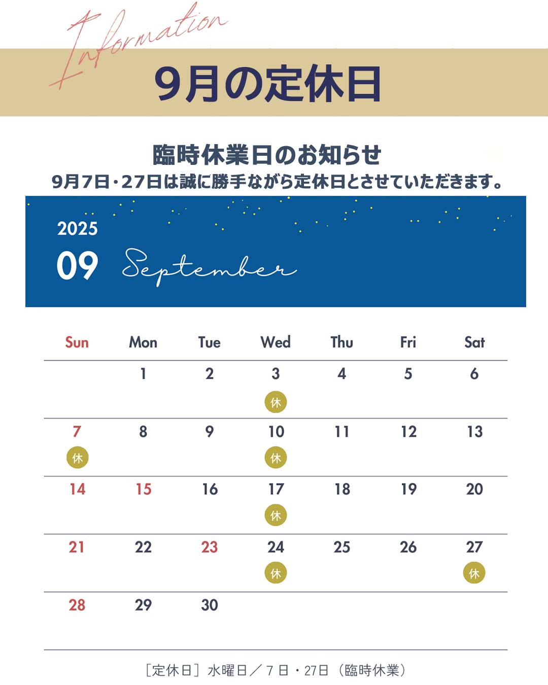 誠に勝手ながら9月7日・27日は臨時休業とさせていただきます。