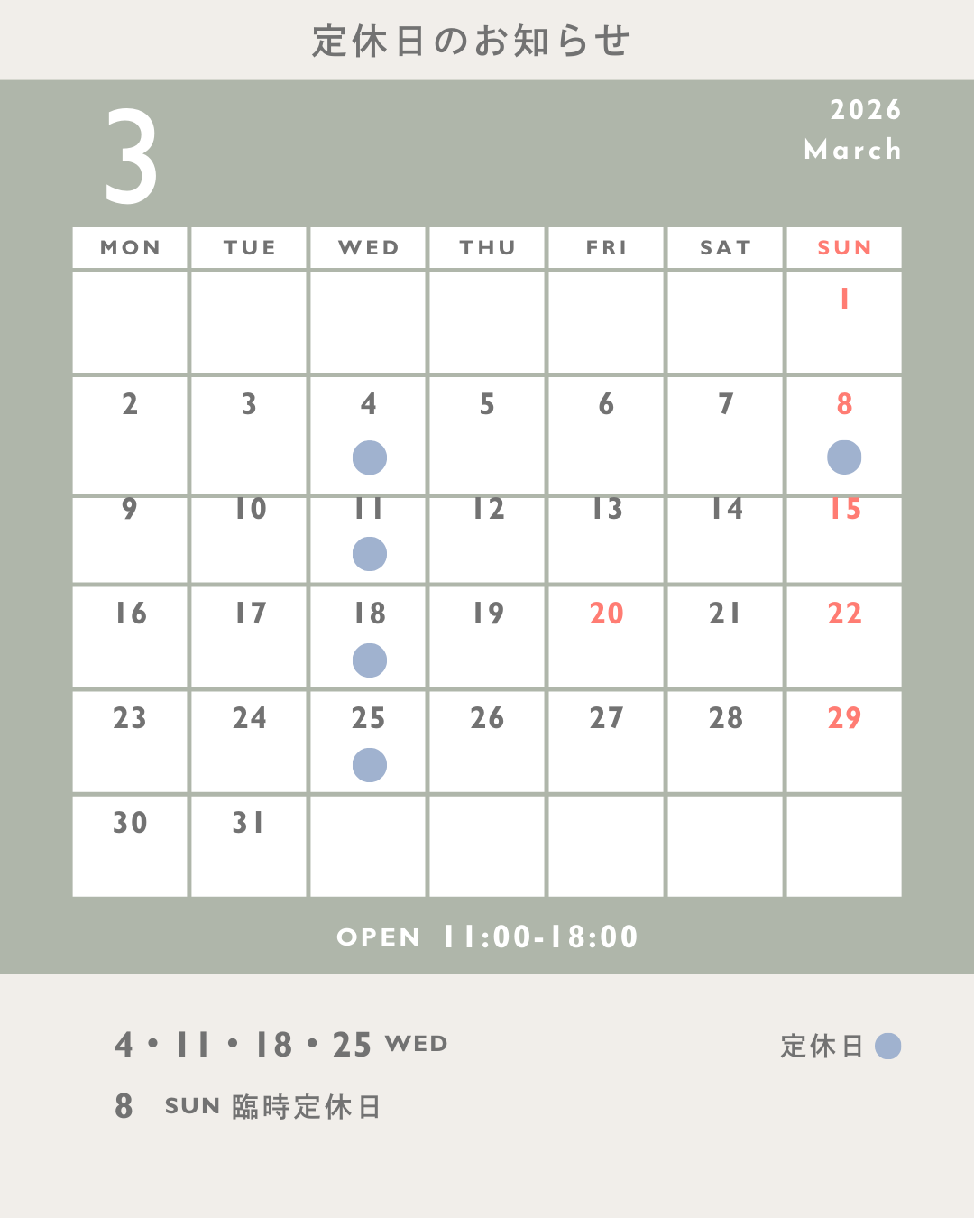 【3月の定休日のお知らせ】