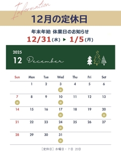年末年始は12月31日(水)~1月5日(月)を休業とさせていただきます。