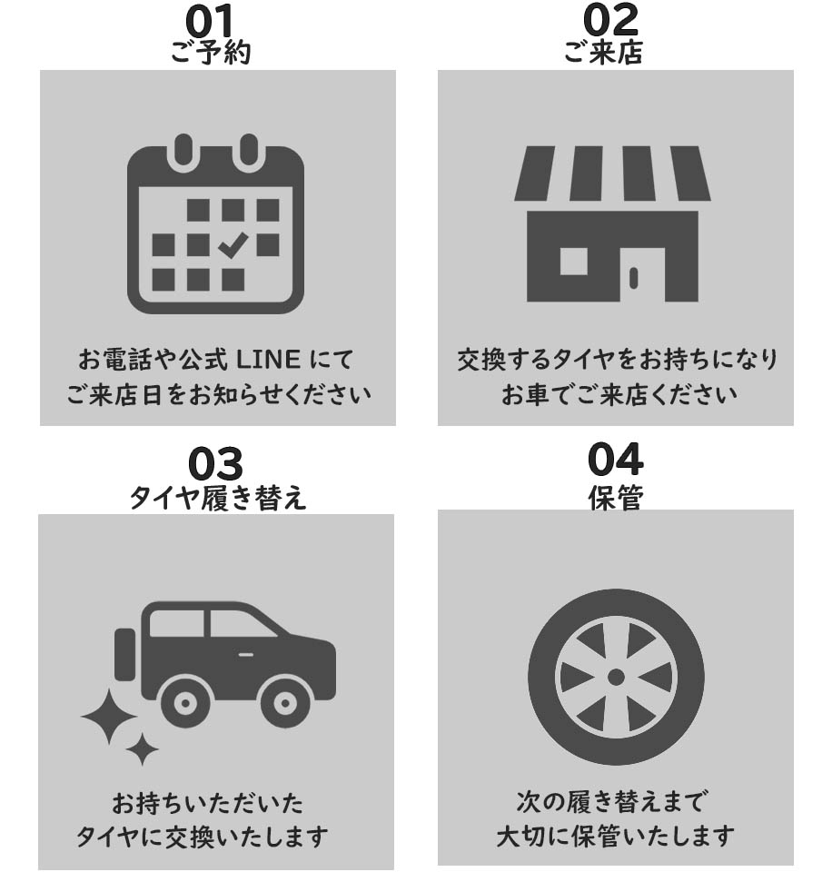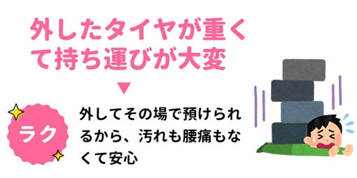 ・タイヤの引き取りが契約満了月を超過した場合、1ヶ月ごとに¥2.200が別途必要となります。