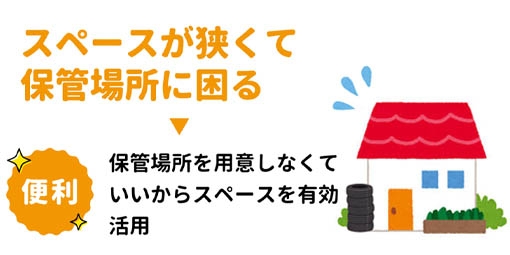 ノーマルタイヤやスタッドレスタイヤを履き替え時に、使わないタイヤをお預かりし倉庫で保管するサービスです。保管場所の確保や持ち運びの手間が省け、タイヤの劣化や盗難の心配も減ります。