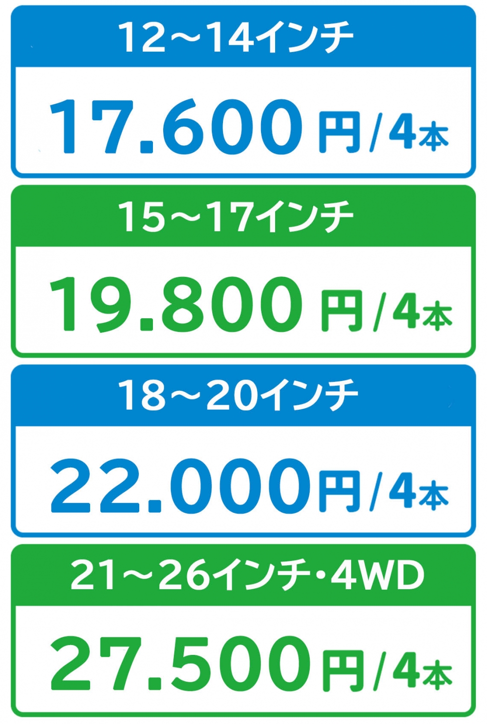 ・背面タイヤなど5本目からは¥1.100/本 追加料金が必要となります。